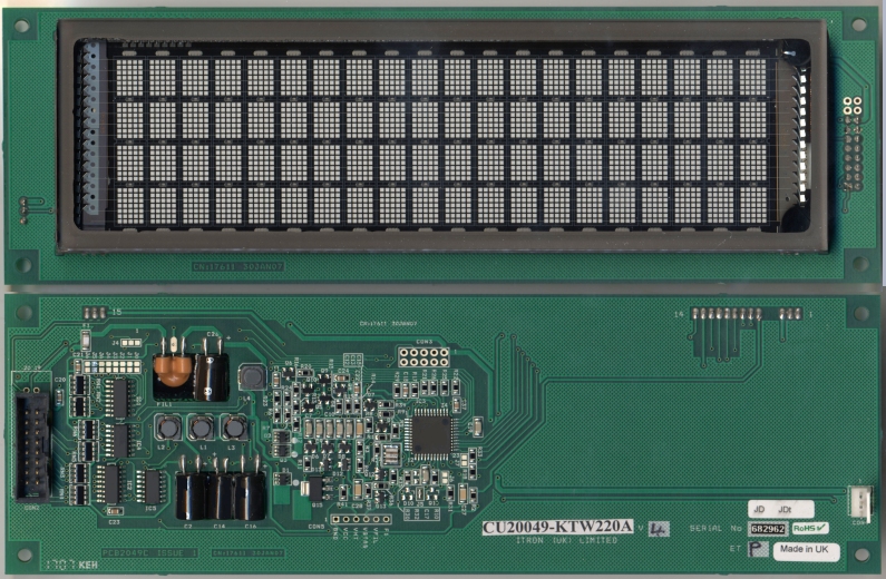 CU20049-KTW220A 4x20 bold character VFD. Operating Temp -40°C to +85°C. Single 5V Supply. High Brightness Blue Green Display. Part Number CU20049-KTW220A Part Suffix -KTW220A Char Heights Std 9.1mm UDF 16 characters PCB Size 222x74 mm Quick Spec Power Supply 5VDC @ 1100mA Full Spec Parallel Bus 8 bit Parallel MTBF Serial Ports Async Serial Mechanical Font Sizes 5x7 Environmental Font Types ASCII + Katakana + Extended 3D Image Options Alternative connectors PCB Image Semi-Custom Fonts & Firmware ModMaster Download Software File Price & Delivery Print