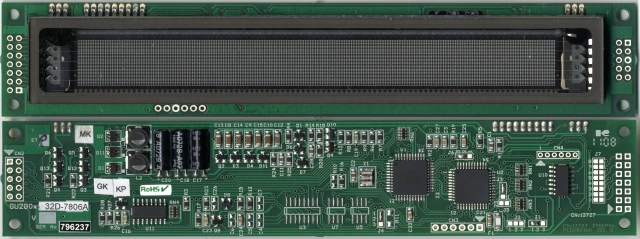 GU280x32D-7806A/C 4x40 LCD Emulation using graphic VFD 280x32 dots with draw commands and unique 'pass-thru' serial port Part Number GU280X32D-7806Ax Part Suffix 7806A 7806AC Char Heights Std 2.79mm Large 11.61mm UDF + European + Cyrillic PCB Size 182x33.5 mm Quick Spec Power Supply 5VDC @ 470mA Full Spec Parallel Bus M68/i80 4/8bit Bi-Direct MTBF Serial Ports Async , SPI , User Ports Mechanical Font Sizes 5x5, 5x7, 7x7, 7x15, 10x14, 20x28 Environmental Font Types LCD + International 3D Image Options Connectors prefitted PCB Image Semi-Custom Fonts and Commands ModMaster Download Software File Price & Delivery Print