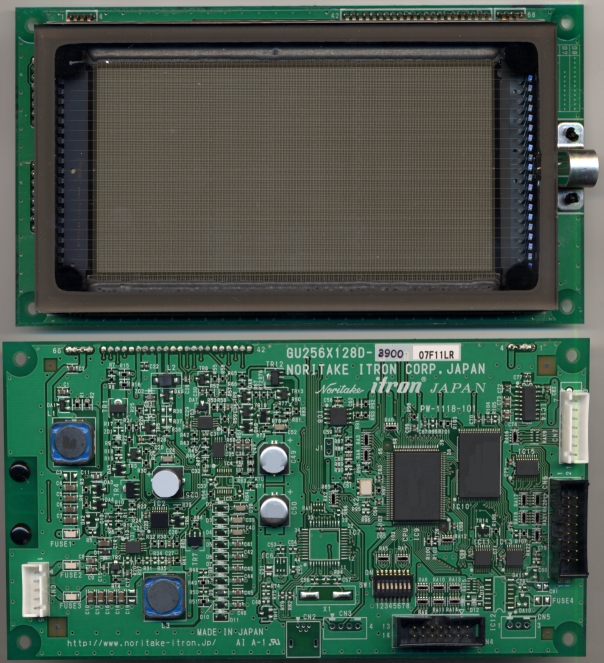 GU256x128D-3900 Up to 16 lines of 42 characters using a 256x128 dot graphic VFD. This module provides multi-sized international fonts, user command macro storage, bit map download and user I/O for key scan and LED drive. Parallel and RS232 interfaces. Part Number GU256x128D-3900 Part Suffix -3900 Char Heights Std. 3.45mm Large 14.25mm Quick Spec PCB Size 170x90mm Full Spec Power Supply 5VDC @ 850mA Software Spec Parallel Bus /WR 8bit MTBF Serial Ports RS232 Mechanical Font Sizes 6x8, 8x16, 16x16, 16x32 Environmental Font Types ASCII + Asian 3D Image Options Alternative connectors PCB Image Semi-Custom ModMaster Download Software File Price & Delivery Print