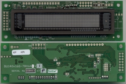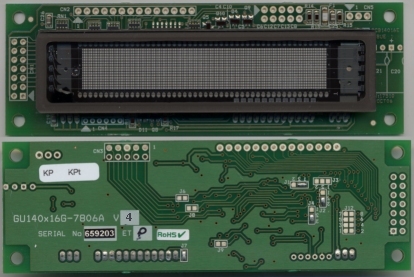 GU140x16G-7806A/C 2x20 LCD Emulation using graphic VFD 140x16 dots with draw commands and unique 'pass-thru' serial port Part Number GU140X16G-7806Axx Part Suffix 7806A 7806AC Char Heights Std 4.9mm Large 10mm UDF + European + Cyrillic PCB Size 116x37 mm Quick Spec Power Supply 5VDC @ 290mA Full Spec Parallel Bus M68/i80 4/8bit Bi-Direct MTBF Serial Ports Async , SPI , User Ports Mechanical Font Sizes 5x5, 5x7, 10x14 Environmental Font Types LCD + International 3D Image Options Connectors prefitted PCB Image Semi-Custom Fonts and Commands ModMaster Download Software File Price & Delivery Print