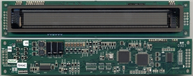 GU280x16G-7806A/C 2x40 LCD Emulation using graphic VFD 280x16 dots with draw commands and unique 'pass-thru' serial port Part Number GU280X16G-7806Ax Part Suffix 7806A 7806AC Char Heights Std 4.7mm Large 9.6mm UDF + European + Cyrillic PCB Size 182x33.5 mm Quick Spec Power Supply 5VDC @ 400mA Full Spec Parallel Bus M68/i80 4/8bit Bi-Direct MTBF Serial Ports Async , SPI , User Ports Mechanical Font Sizes 5x5, 5x7, 10x14 Environmental Font Types LCD + International 3D Image Options Connectors prefitted PCB Image Semi-Custom Fonts and Commands ModMaster Download Software File Price & Delivery Print