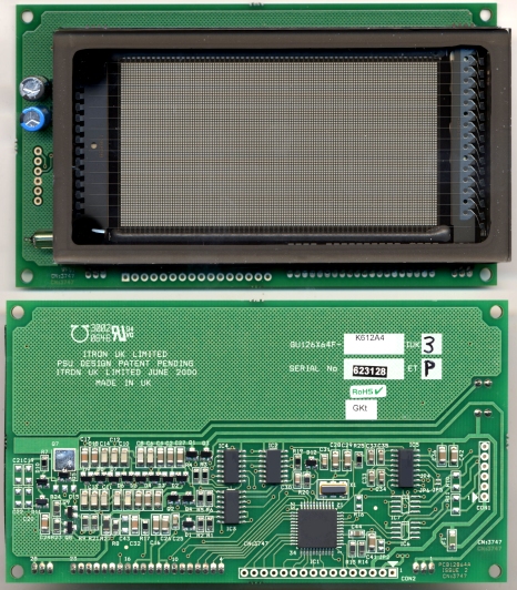 GU126x64F-K612A4 Up to 8 lines of 21 characters plus graphics using a 126x64 dot graphic VFD. 8 user ports with auto key scan. 3 font sizes. Part Number GU126x64F-K612A4 Part Suffix -K612A4 Char Heights Std 4.4mm UDF PCB Size 129x72 mm Quick Spec Power Supply 5VDC @ 750mA Full Spec Parallel Bus User ports MTBF Serial Ports SPI RS232 Serial Mechanical Font Sizes 5x5, 5x7, 10x14 Environmental Font Types ASCII + International 3D Image Options Connectors prefitted PCB Image Semi-Custom Fonts and Commands ModMaster Download Software File Price & Delivery Print