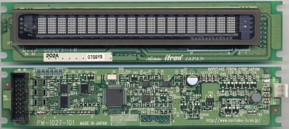 CU209-TW202A 4x20 bold character VFD. Operating Temp -40°C to +85°C. Single 5V Supply. High Brightness Blue Green Display. Part Number CU209-TW202A Part Suffix -TW202A Char Heights Std 8.85mm UDF 16 characters PCB Size 164x34 mm Quick Spec Power Supply 5VDC @ 240mA Full Spec Parallel Bus 8 bit Parallel MTBF Serial Ports Async Serial Mechanical Font Sizes 5x7 Environmental Font Types ASCII + Katakana + Extended 3D Image Options Alternative connectors PCB Image Semi-Custom ModMaster Download Software File Price & Delivery Print