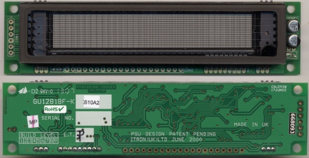 GU128x18F-K61xA2 Up to 2 lines of 21 characters plus graphics using a 128x18 dot graphic VFD. Choice of serial interface versions with 8 user ports capable of key scan. 2 font sizes. Part Number GU128x18F-K61xA2 Part Suffix -K610A2 -K612A2 Char Heights Std 5.2mm Large 10.6mm UDF CMOS Async + SPI RS232 + SPI PCB Size 126x30 mm Quick Spec Power Supply 5VDC @ 300mA Full Spec Parallel Bus MTBF Serial Ports Async , SPI , User Ports, RS232 Mechanical Font Sizes 5x7, 10x14 Environmental Font Types ASCII 3D Image Options Connectors pre-fitted PCB Image Semi-Custom Fonts and Commands ModMaster Download Software File Price & Delivery Print