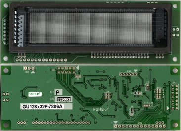 GU128x32F-7806A/C 4x16 LCD Emulation using graphic VFD 128x32 dots with draw commands and unique 'pass-thru' serial port Part Number GU128X32F-7806Axx Part Suffix 7806A 7806AC Char Heights Std 5mm Large 20mm UDF + European + Cyrillic PCB Size 122x44 mm Quick Spec Power Supply 5VDC @ 435mA Full Spec Parallel Bus M68/i80 4/8bit Bi-Direct MTBF Serial Ports Async , SPI , User Ports Mechanical Font Sizes 5x5, 5x7, 10x14 Environmental Font Types LCD + International 3D Image Options Connectors prefitted PCB Image Semi-Custom Fonts and Commands ModMaster Download Software File Price & Delivery Print