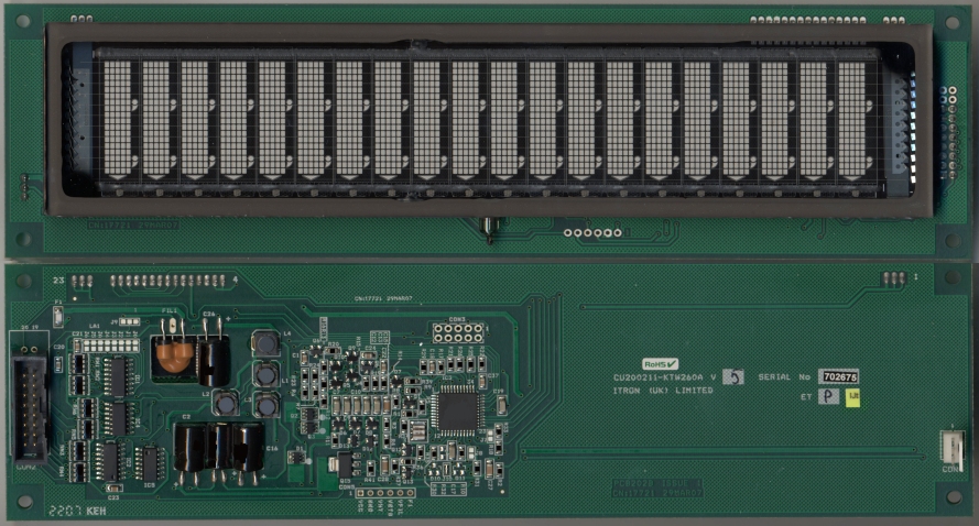 CU200211-KTW260A 2x20 bold character VFD. Operating Temp -40°C to +85°C. High Speed Parallel/TTL Serial Interface. Part Number CU200211-KTW260A Part Suffix -KTW260A Char Heights Std 11.3mm UDF 16 characters PCB Size 248x39 mm Quick Spec Power Supply 5VDC @ 1100mA Full Spec Parallel Bus 8bit Parallel MTBF Serial Ports TTL Serial Mechanical Font Sizes 5x7 Environmental Font Types ASCII + Katakana + Extended 3D Image Options Alternative connectors PCB Image Semi-Custom Fonts & firmware ModMaster Download Software File Price & Delivery Print