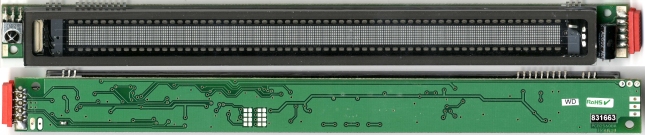 GU256x8F-K660A7 42 character module using graphic VFD 256x8 dots with infrared receiver. Part Number GU256x8F-K660A7 Part Suffix K660A7 Char Heights 5.0mm UDF PCB Size 212x18.5 mm Quick Spec Power Supply 5VDC @ 250mA Full Spec Parallel Bus MTBF 1,000,150 hrs Serial Ports Async, SPI Mechanical Font Sizes 5x7 Environmental Font Types ASCII & European 3D Image Options Connector options PCB Image Semi-Custom Fonts and Commands ModMaster Download Software File Price & Delivery Print