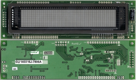 GU140x16J-7806A/C 2x20 LCD Emulation using graphic VFD 140x16 dots with draw commands and unique 'pass-thru' serial port Part Number GU140X16J-7806Axx Part Suffix 7806A 7806AC Char Heights Std 8.13mm Large 16.43mm UDF + European + Cyrillic PCB Size 146x43 mm Quick Spec Power Supply 5VDC @ 250mA Full Spec Parallel Bus M68/i80 4/8bit Bi-Direct MTBF Serial Ports Async , SPI , User Ports Mechanical Font Sizes 5x5, 5x7, 10x14 Environmental Font Types LCD + International 3D Image Options Connectors prefitted PCB Image Semi-Custom Fonts and Commands ModMaster Download Software File Price & Delivery Print